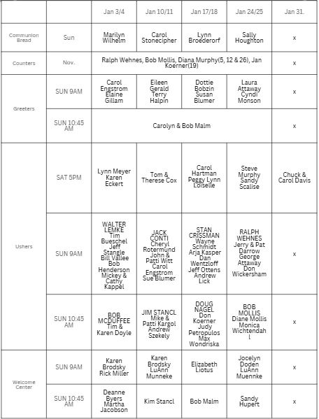 on Tuesday, January 6th. For more information contact: Donna Kelly through the church office 847-669-9448.